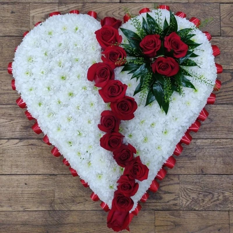A heart of white chrysanthemums broken by red roses with a red rose spray. Available with or without ribbon