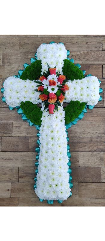 Chrysanthemums cross with an orange and white spray and green ribbon. The spray and ribbon can be changed to a colour of your choice.