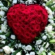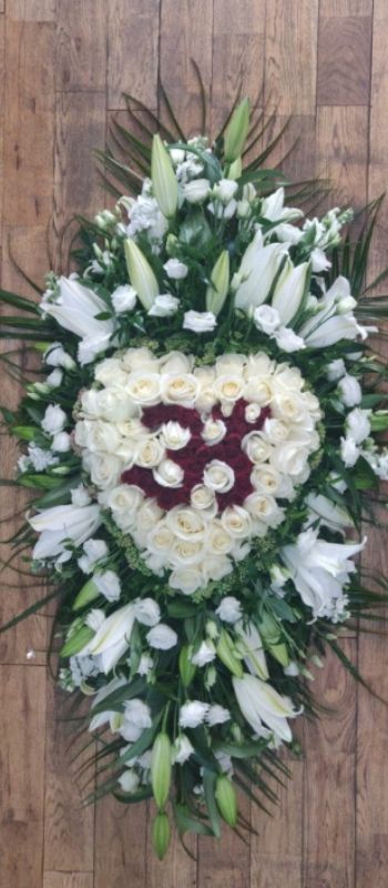 A beautiful white rose heart with a Hindu Aum in red roses set within an elegant mix of white lilies, white roses, white eustoma, white gypsophila and green foliage.