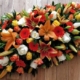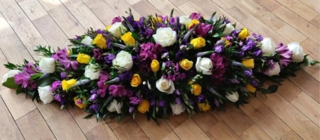 A mix of yellow and white roses with purple alstroemeria mixed with green foliage.