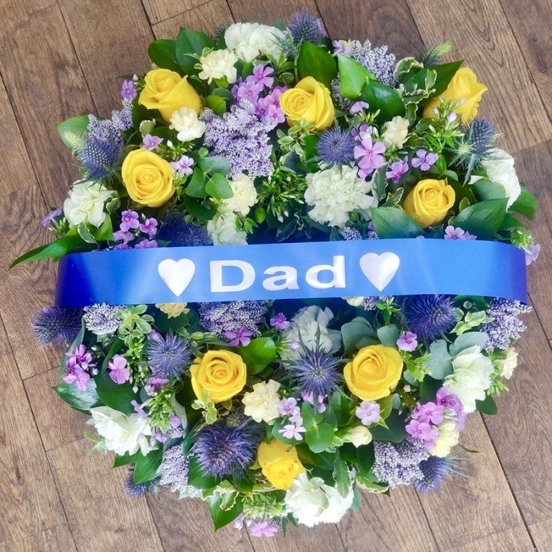 Yellow roses, lilac veronica and green foliage. We can add personalised ribbons to any tribute