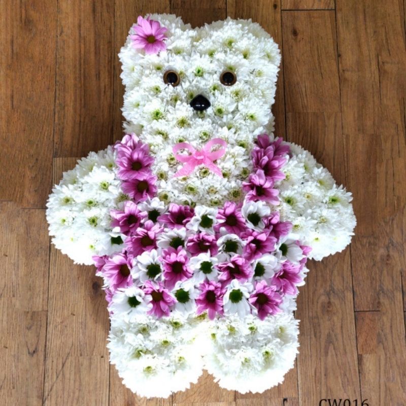 Girl teddy made with white chrysanthemums dressed in a little pink and white dress. The colour can be changed to your choice.