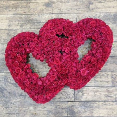 A double heart of red spray roses. This piece is only available in one size.