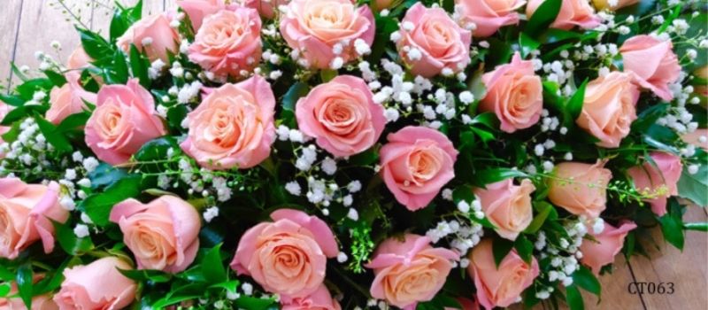 A mix of peach roses set in a bed of gypsophila and greenery.