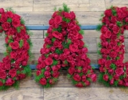 White chrysanthemums edged in red ribbon with red sprays. Ribbon and sprays can be changed to a colour of your choice.