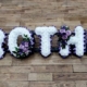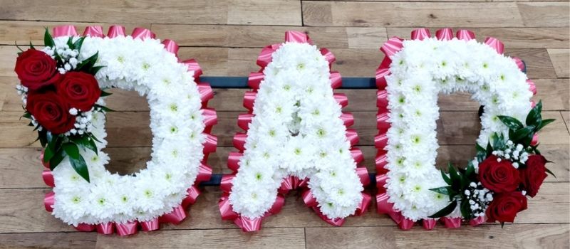 White chrysanthemums with a red rose spray all edged with a red ribbon. Sprays and ribbons can be changed to a colour of your choice.