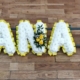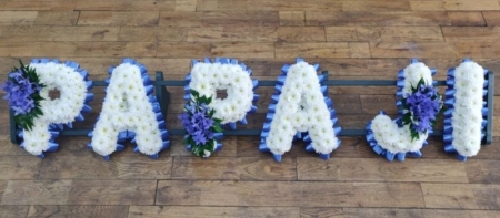 White chrysanthemums with a blue spray all edged with a blue ribbon. Sprays and ribbons can be changed to a colour of your choice.