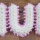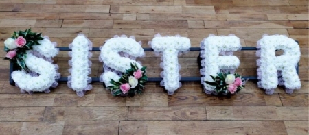 White chrysanthemums with a peach and white spray all edged with a lilac lace ribbon. Sprays and ribbons can be changed to a colour of your choice.