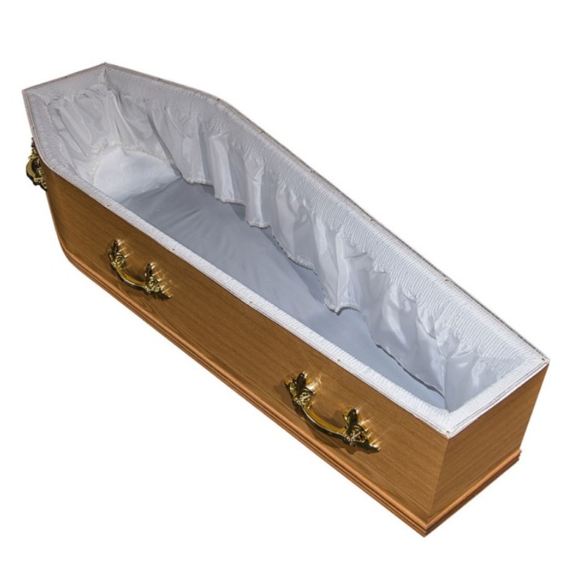 A simple unvarnished simulated Oak veneered coffin, complete with with six Gold effect handles, nameplate, wreath holders, fitted with a simple cream lining, suitable for either cremation or burial.
