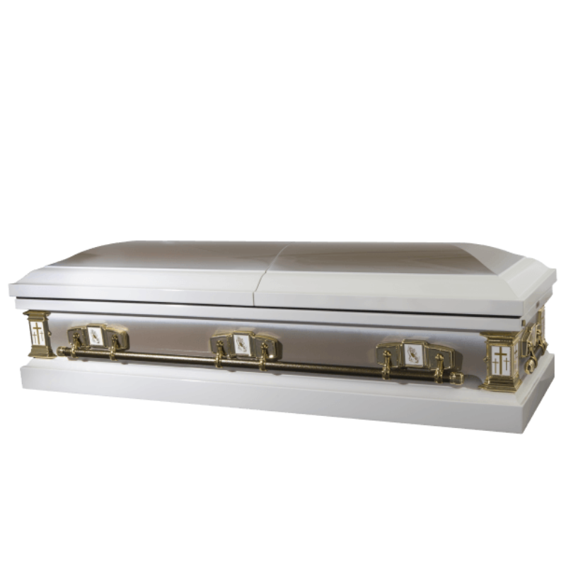 20ga Steel casket. White finish with Gold shading. Pure White ruched crepe interior with praying hands motif on lid panel. Split lid with cross design corners, swung bar handles and adjustable bed. Hermetically sealing and suitable for international transportation. Suitable for burial only.