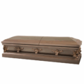 18ga Steel casket. Brushed Steel finish with Lilac and Copper shading. Pale Pink smocked crepe interior with rose motif on lid panel. Split lid with moulded garden corners, fixed bar handles and adjustable bed. Hermetically sealing and suitable for international transportation. Suitable for burial only.