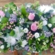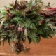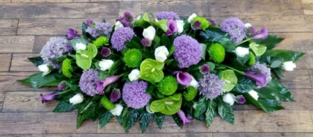 A mix of purple calla lilies, alliums and green anthuriums set in a mixture of beautiful foliage. Please note that the alliums will be replaced when not in season.