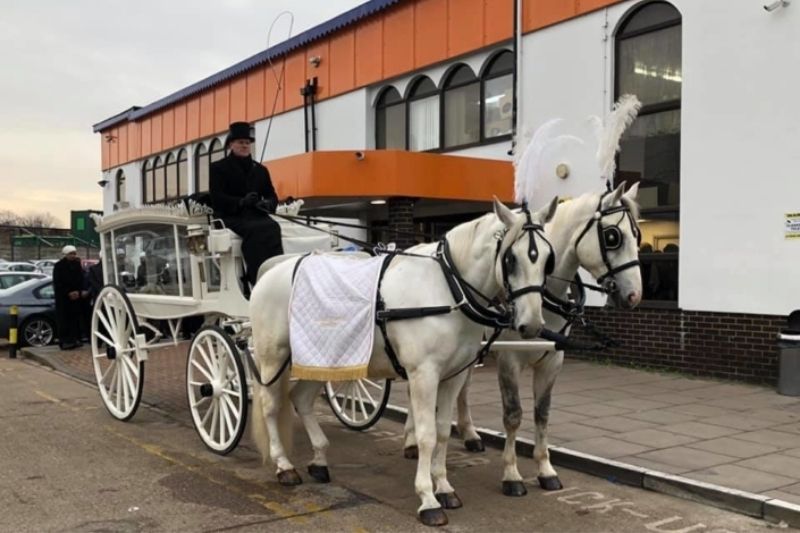 White Horse Drawn Hearse with a Pair of Grey Horses and White Plumes